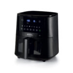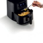 La freidora de aire cocina gracias al aire a alta temperatura, de hasta 200 °C, que circula a máxima velocidad a 360° dentro de la cámara de cocción y garantiza una distribución uniforme del calor. Este aire caliente permite una cocción homogénea de los platos y una corteza crujiente, tan buena como la fritura tradicional. Gracias al aire caliente, no será necesario añadir mucho aceite para obtener frituras sabrosas, ya que basta con una cucharada. De esta manera, servirá platos más ligeros, pero sabrosos para toda la familia.