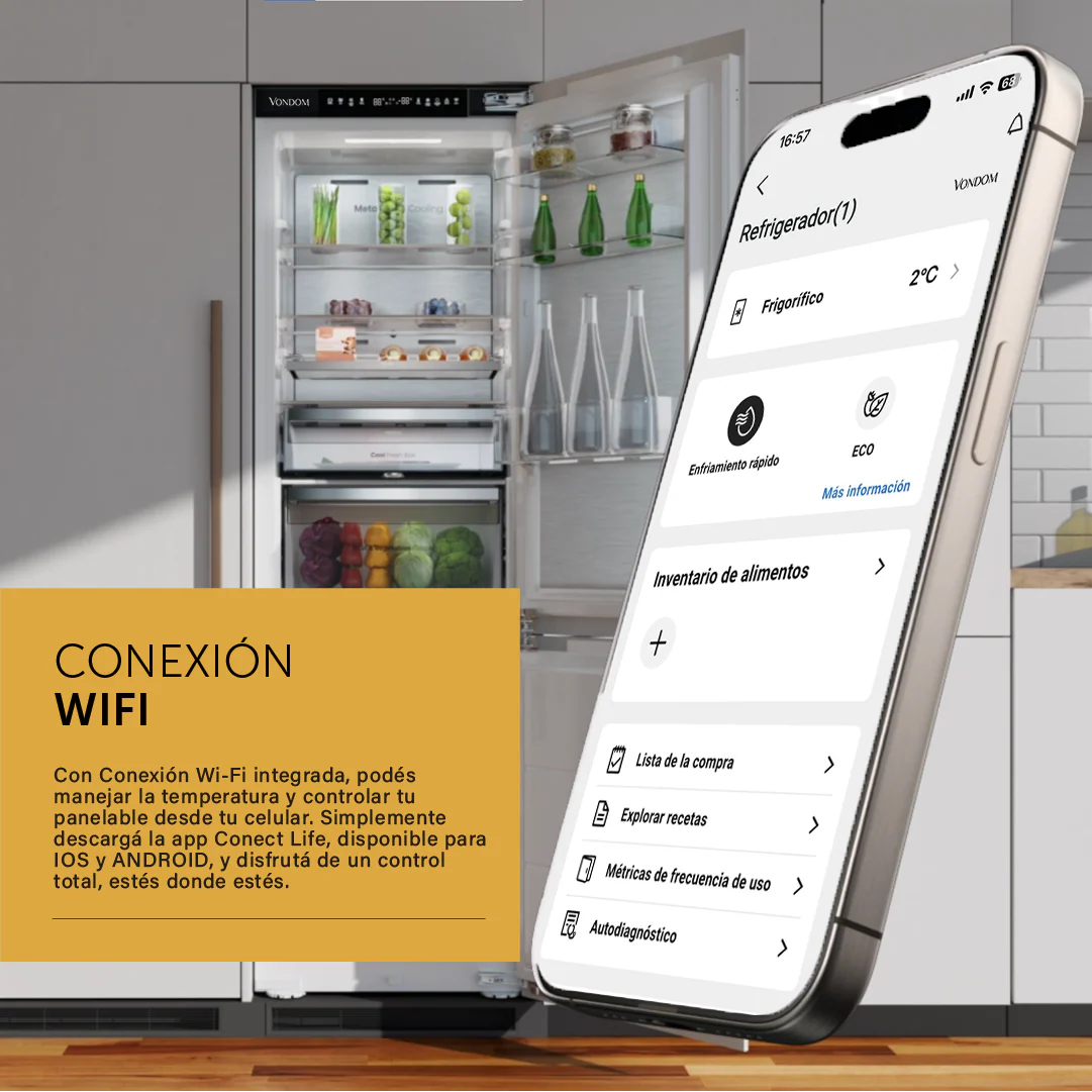 La Heladera Combi Panelable Vondom (250 L) con Wi-Fi, tecnología Inverter y No-Frost combina diseño moderno, eficiencia energética y funciones inteligentes para mantener tus alimentos frescos por más tiempo. Ideal para cocinas integradas con estilo y confort tecnológico.