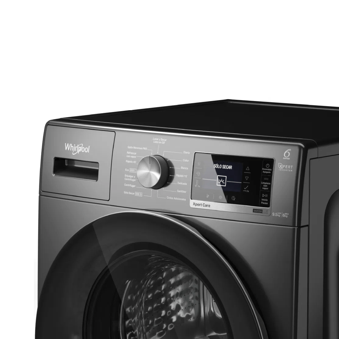 Descubre el lavasecarropas Whirlpool con 24 ciclos, tecnología 6To Sentido y Xpert Inverter. Capacidad de 9.5 kg para lavado y 6 kg para secado. Eficiencia energética A++.