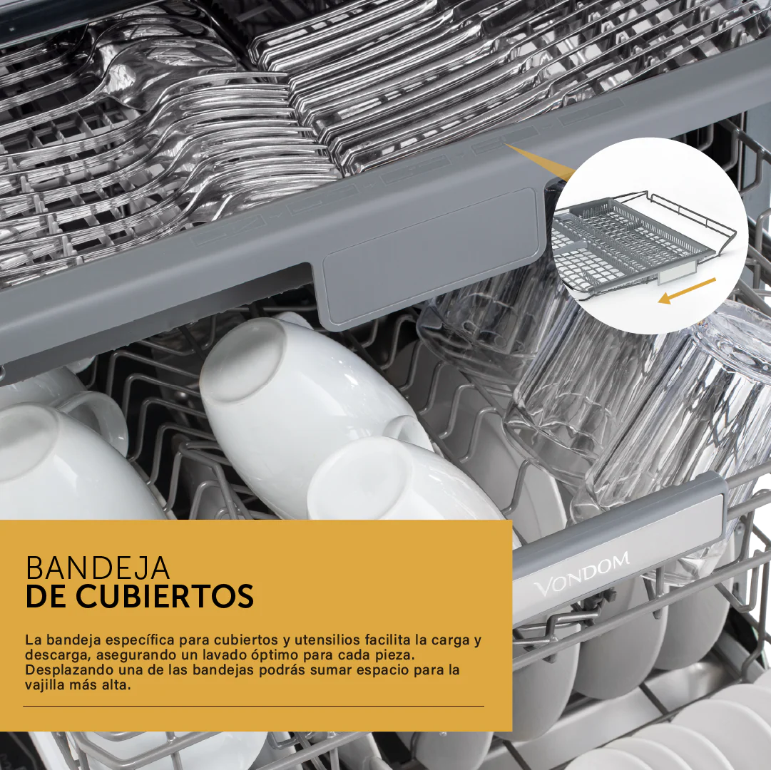 El lavavajillas panelable de 14 cubiertos Vondom es una solución completa para quienes buscan eficiencia, comodidad y estética integrada en su cocina. Con capacidad para 14 cubiertos, ofrece espacio suficiente para lavar platos, vasos, ollas y cubiertos con un alto nivel de limpieza y cuidado.